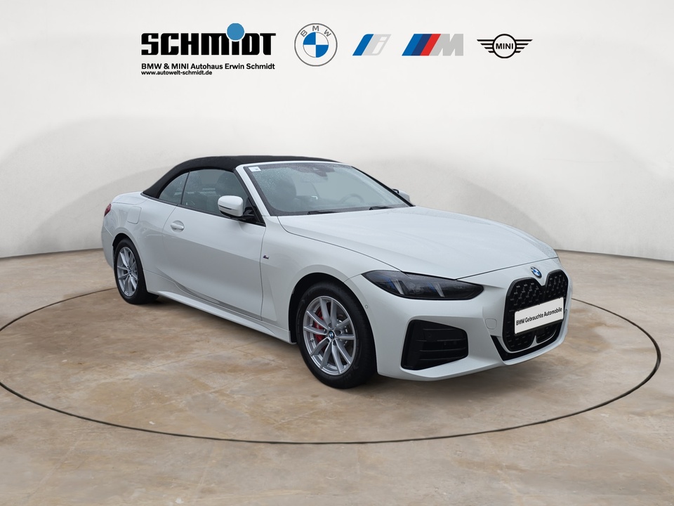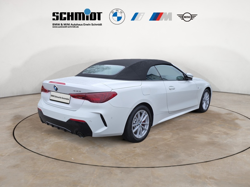 M Sportpaket Innovationspaket M Sportpaket Pro Adaptiver LED-Scheinwerfer Leder Vernasca mit Dekorsteppung Schwarz, Mokka Comfort Paket Aktive Geschwindigkeitsregelung mit Stop&Go-Funktion (ACC) Nackenwärmer Instrumententafel Luxury HiFi Lautsprechersystem M Interieurleisten Aluminium Rhomicle Lenkradheizung Lehnenbreitenverstellung für Fahrer M Sicherheitsgurte Fernlichtassistent Bereifung mit NotlaufeigenschaftenSonderausstattung ab Werk Steptronic Sport Getriebe Variable Sportlenkung Alarmanlage Komfortzugang M Sportbremse rot.hochglänzend M Leuchten Shadow Line Innen- und Außenspiegelpaket Innenspiegel.automatisch abblendend Lordosenstütze für Fahrer und Beifahrer Ablagenpaket Sitzheizung für Fahrer und Beifahrer Ambientes Licht Klimaautomatik mit 2-Zonen-Regelung Driving Assistant Parking Assistant Plus Wireless Charging Ablage BMW Live Cockpit Professional M Sportfahrwerk M Lederlenkrad M Hochglanz Shadow Line BMW Individual Hochglanz Shadow Line mit erweiterten UmfängenSerienaustattung Vier Sitzplätze mit Sitzkonfiguration: 2+2 Sechs Lautsprecher Subwoofer 4 Scheibenbremsen (4 innenbelüftet) ABS Elektr. Sitz-Memory für Außenspiegel Geschwindigkeitsregelanlage Beleuchteter Make-up-Spiegel für Fahrer und Beifahrer Einparkhilfe vorne Sensor, Einparkhilfe hinten Sensor & Kamera, Einparkhilfe seitlich Sensor Permanenter Vierradantrieb Sperrdifferential mit begrenztem Schlupf elektronisches, vorne und hinten Antriebs-Schlupf-Regelung Turboaufladung Kraftstoff : bleifrei, 95 Oktan Tankinhalt 59 Liter Bordcomputer mit Durchschnittskraftstoffverbrauch Tagfahrlicht Kopf-/Dach Airbag vorn und hinten Zentralverriegelung (mit Fernbedienung) Alarmanlage Motorleistung nach EEC : Maximalleistung in KW: 180 , Maximalleistung in PS: 245 bei 4.500 U/min , Maximales Drehmoment in Nm: 400 bei 1.600 U/min Elektrisch Softtopes mit Heckfenster aus Glas Fahrer-Airbag, Beifahrer-Airbag mit Deaktivierung für Beifahrerairbag Seiten-Airbag vorne 2 höhenverstellbare Kopfstützen vorne, 2 Kopfstützen hinten Sicherheitsgurte vorn für Fahrer und Beifahrer Gurtbringer Sicherheitsgurte hinten links und rechts Armlehne für Vordersitze Fahrersitz Sportsitz mit vier elektr. Verstellmöglichkeiten, Sitzheizung, Lehnenneigungsverstellung mit Memory, Längsverstellung mit Memory, Längsverstellung mit Memory, Sitzflächenneigungsverstellung mit Memory und mechanischer Oberschenkelauflage, Beifahrersitz Sportsitz mit drei elektr. Verstellmöglichkeiten, Sitzheizung, elektrischer Lehnenneigungsverstellung, elektrischer Längsverstellung, elektrischer Höhenverstellung und mechanischer Oberschenkelauflage Multifunktions-Alu & Lederlenkrad höhenverstellbar und längsverstellbar Unabhängige Ein-Gelenk-Federbeinachse mit Stabilisator und Schrauben-Federung vorne, Unabhängige Mehrlenkerachse mit Stabilisator und Schrauben-Federung hinten 8-Gang Automatikgetriebe mit manueller Gangwahl und Schalthebel am Lenkrad Automatik mit manuellem Modus, Schaltwippen und 0 Windschutzscheiben-Wisch-Wasch-Anlage mit Regensensor Elektrische Fensterheber mit Impulsschaltung für zwei Fenster vorn Gewichte: Zulässiges Gesamtgewicht (kg): 2.260, Leergewicht (kg): 1.840, Anhängelast gebremst (kg): 1.800 und Anhängelast ungebremst (kg): 750 Navigationssystem mit Bedienung über Touch Screen, Datenquelle: Internet 14,90 Zoll-Bildschirm, Verkehrsinformation und Verkehrsinfo Monate inklusive: 24 Windschott hinter Sitzen Vorbereitung Featrues on demand Isofix Sprachbedienung herstellereigen und KI unterstützt Telematik mit automatischem Notruf, mit SIM im Fahrzeug, Tracking System, Concierge Service Monate inkl.: und Pannenhilfe Kraftstoffverbrauch WLTP ICE, 7,3 l/100 km kombiniert, 7,3, 8,0, 13,7, 12,5, 9,8, 7,4, 6,3, 7,0, 32, 29, 24, 32, 37 und 34 Knie-Airbags Fahrer Lokale Sprache Deutsch, BMW, 4er-Reihe, 430i xDrive Cabrio A und 430i xDrive Cabrio A Autom. Warnblinker bei starker BremsungWeitere Ausstattung SCHMIDT- Garantiepaket - 5 Jahre ab Erstzulassung! Winterräder statt Sommerräder inkl. 24 Monate BMW Premium Selection Garantie, ohne jegliche Selbstbeteiligung im Schadensfall!GarantieBMW Premium Selection