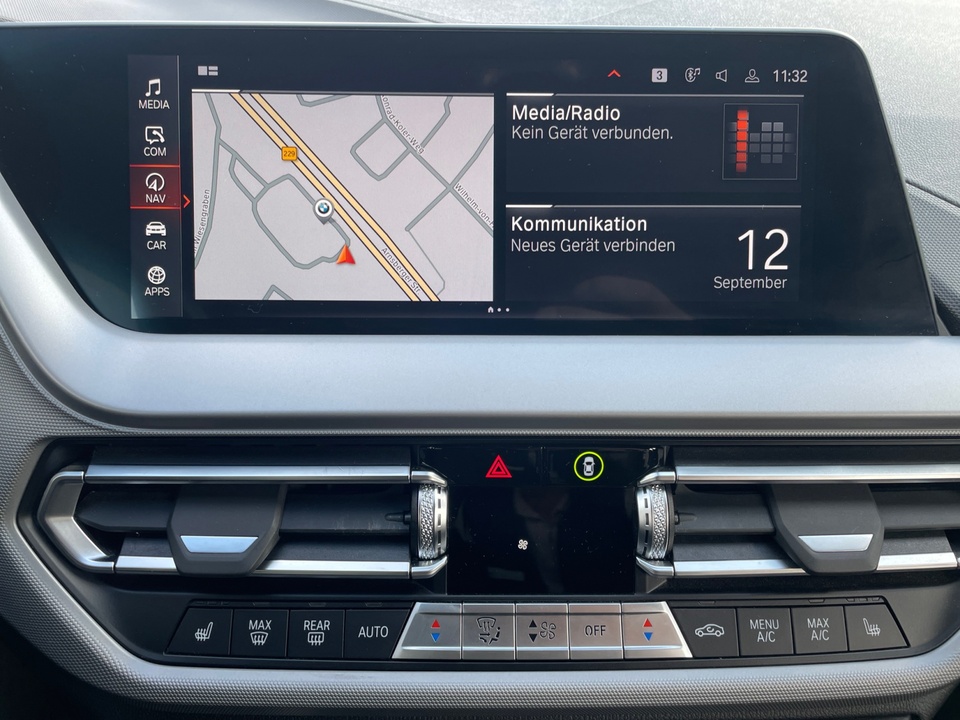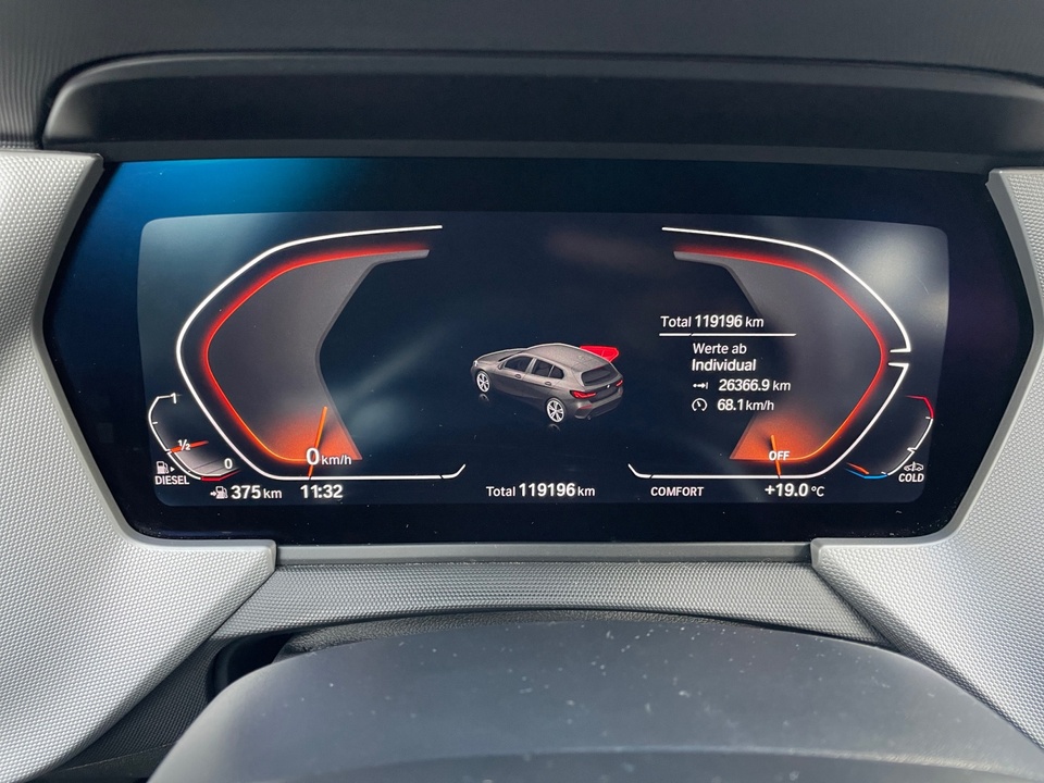 Steptronic Getriebe 17' Leichtmetallräder Doppelspeiche 548 Bicolor Comfort Paket Klimaautomatik mit 2-Zonen-Regelung Adaptive LED-Scheinwerfer Sitzheizung für Fahrer und Beifahrer Sonnenschutzverglasung Lordosenstütze für Fahrer und Beifahrer M Lederlenkrad Innenspiegel, automatisch abblendend Fernlichtassistent Reifenpannenset Größerer Kraftstofftank - um 8Liter vergrößertes Volumen des Kraftstofftanks BMW Connected Package ProfessionalSonderausstattung ab Werk Radschraubensicherung Fußmatten in Velours.anthrazit Ablagenpaket Park Distance Control (PDC) vorne und hinten Geschwindigkeitsregelung mit Bremsfunktion BMW Live Cockpit Professional WLAN HotspotSerienaustattung Fünf Sitzplätze mit Sitzkonfiguration: 2+3 Sechs Lautsprecher Subwoofer 4 Scheibenbremsen (2 innenbelüftet) ABS Geschwindigkeitsregelanlage Make-up-Spiegel für Fahrer und Beifahrer Einparkhilfe vorne, hinten Sensor Frontantrieb Sperrdifferential mit begrenztem Schlupf elektronisches und vorne Antriebs-Schlupf-Regelung Eins Turboaufladung Kraftstoffsystem mit Common Rail Kraftstoff : Diesel Tankinhalt 42 Liter Bordcomputer mit Durchschnittskraftstoffverbrauch Tagfahrlicht Kopf-/Dach Airbag vorn und hinten Zentralverriegelung mit Schließung der elektr. Fenster Motorleistung nach EEC : Maximalleistung in KW: 110 , Maximalleistung in PS: 150 bei 4.000 U/min , Maximales Drehmoment in Nm: 350 bei 1.750 U/min Fahrer-Airbag, Beifahrer-Airbag mit Deaktivierung für Beifahrerairbag Seiten-Airbag vorne 2 höhenverstellbare Kopfstützen vorne, 3 höhenverstellbare Kopfstützen hinten Sicherheitsgurte vorn für Fahrer und Beifahrer , Gurtstraffer vorne Sicherheitsgurte hinten links, Sicherheitsgurte hinten rechts, Dreipunkt-Gurt hinten Mitte : Armlehne für Vordersitze Fahrersitz Einzelsitz mit mechanischer Lehnenneigungsverstellung, mechanischer Längsverstellung und mechanischer Höhenverstellung, Beifahrersitz Einzelsitz mit mechanischer Lehnenneigungsverstellung und mechanischer Längsverstellung Multifunktions-Lederlenkrad höhenverstellbar und längsverstellbar Unabhängige Ein-Gelenk-Federbeinachse mit Stabilisator und Schrauben-Federung vorne, Unabhängige Mehrlenkerachse mit Stabilisator und Schrauben-Federung hinten 6-Gang Schaltgetriebe manuell Windschutzscheiben-Wisch-Wasch-Anlage mit Regensensor Elektrische Fensterheber mit Impulsschaltung für zwei Fenster vorn und hinten Gewichte: Zulässiges Gesamtgewicht (kg): 1.950, Leergewicht (kg): 1.480, Anhängelast gebremst (kg): 1.300 und Anhängelast ungebremst (kg): 740 Navigationssystem mit Bedienung über Touch Screen, Datenquelle: Internet (Farbe), 10,30 Zoll-Bildschirm, Verkehrsinformation und Verkehrsinfo Monate inklusive: 36 Isofix Sprachbedienung Alexa Telematik mit automatischem Notruf, mit SIM im Fahrzeug, Tracking System, Concierge Service, Concierge Service Monate inkl.: und Pannenhilfe Partikelfilter Kraftstoffverbrauch ECE 99/100, 5,1 l/100 km Stadt, 3,9 l/100 km Überland, 4,4 l/100 km kombiniert und Euro 6d-ISC-FCM, Kraftstoffverbrauch WLTP ICE, 4,7 l/100 km kombiniert, 4,6, 5,4, 21,7, 18,5, 51 und 44 Lokale Sprache Deutsch, BMW, 1er-Reihe, 118d Advantage und Advantage Crash Warnsystem aktiviert Bremslicht, Müdigkeitswarnung, automatische Notbremsung, Bremst bei niedriger Geschwindigkeit, Fußgängerschutz, visuelle/akustische Warnung, Funktion über 130 km/h 78 mph, Funktion über 50 km/h 30 mph und Funktion unter 50 km/h 30 mph Bluetooth Start/Stop Spurassistent Multi-Funktions-Monitor mit 10,30 Zoll Bildschirm Kombi-Instrumente 1 und Bildschirmgröße (cm):, Multi-Funktions-Monitor mit 10,30 Zoll Bildschirm und Touch-Bedienung Armaturenbrett 1 und Bildschirmgröße (cm): Energie Rückgewinnung Verkehrszeichenerkennung Interner Speicher/Festplatte Fahrereinstellungen Motorcharakteristik und Lenkung Wifi Netzwerk Verbindungsart: eingebaute SIM-Karte Katalytische Reduktion Fernbedienung Klimaanlage per Telefon, mit Zeitschaltuhr, mit Heizen und mit Kühlen Installierte Apps App-Steuerung Text - Sprache/Sprache - Text 6 Airbags Mobiltelefonintegration Apple CarPlay, Android Auto, Apple Monate inklusive: 999, Android Monate inklusive: 999, MirrorLink Monate inklusive: 0, Apple drahtlos und Android drahtlos WLTP Emissionen ICE, kombiniert: 122,0, kombiniert Fzg niedrig: 121,0 und kombiniert Fzg hoch: 140,0 Elektrisches System 12 Torque vectoring Differential Remote Services Fensterbruchwarnung, Fahrzeug finden, Ton/Blinken, 999 Monate inklusive, Zielübertragung und Position teilenWeitere Ausstattung inkl. 24 Monate Euro Plus Garantie, ohne jegliche Selbstbeteiligung im Schadensfall!GarantieBMW Premium SelectionIrrtümer und Zwischenverkauf vorbehalten.(CRCO 23.10.2025 11.23)