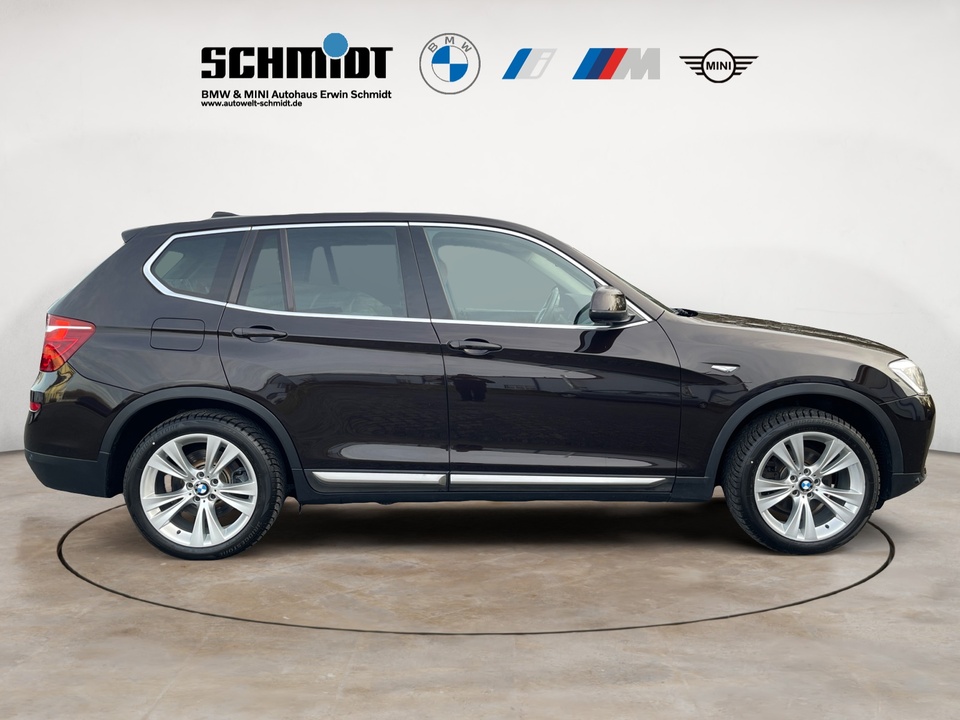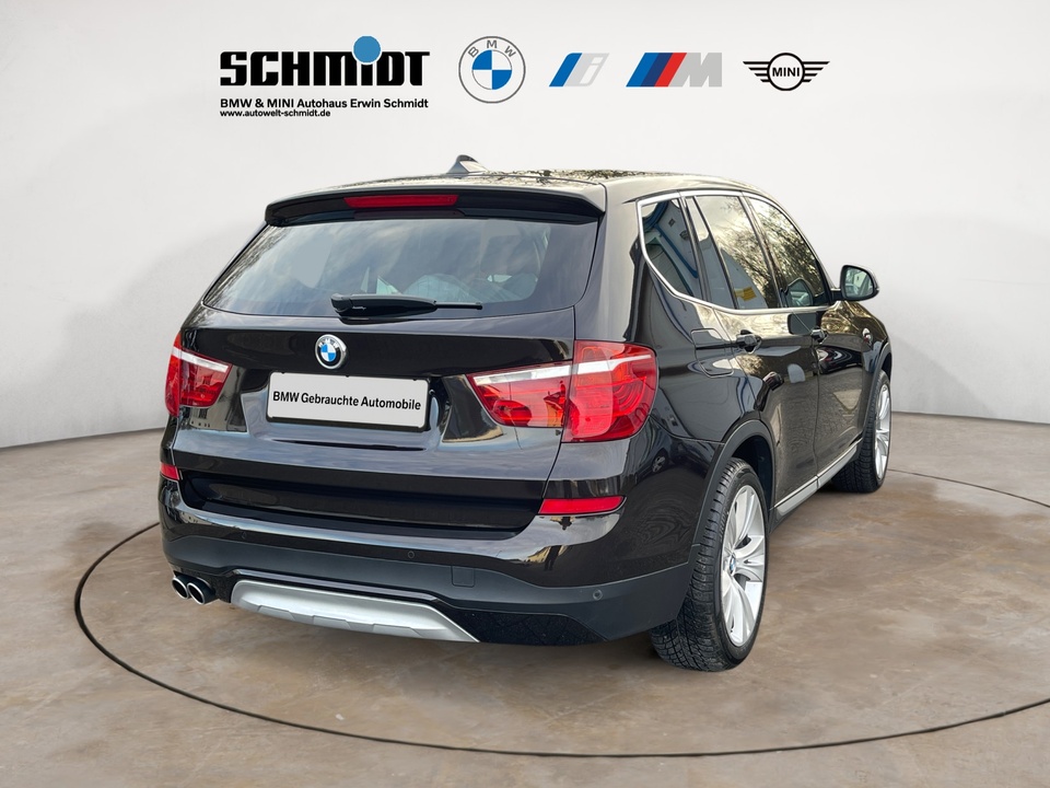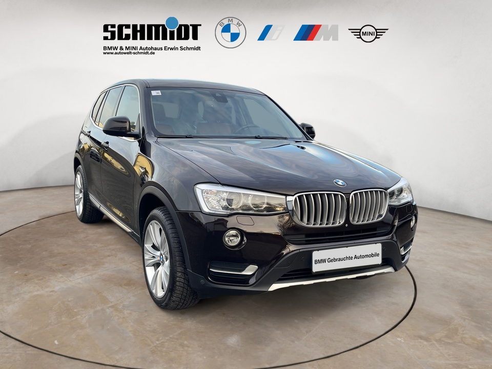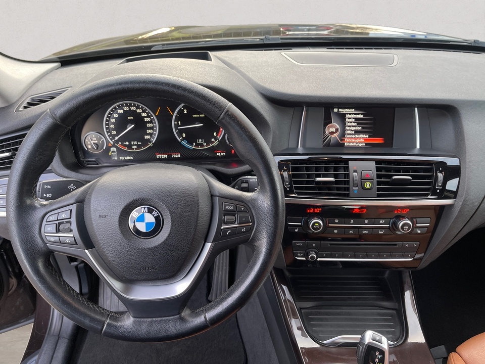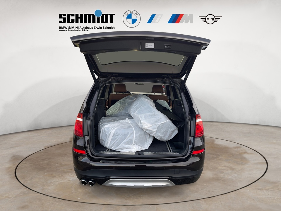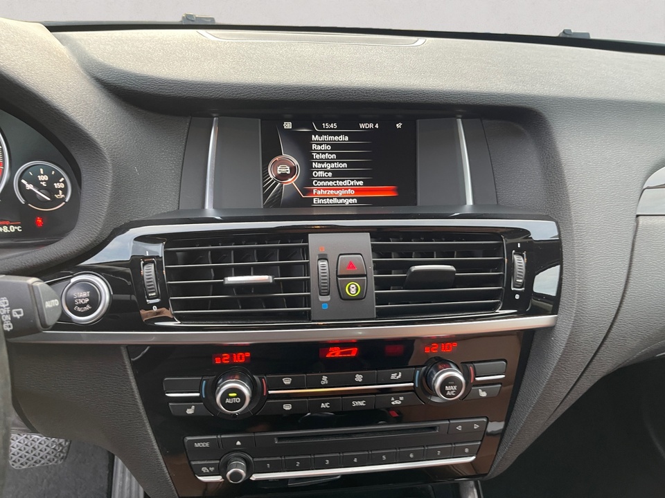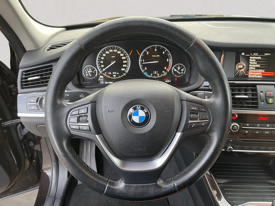 Navigationspaket ConnectedDrive Comfort Paket Driving Assistant Plus (inkl. Notbremsassistent) Panorama-Glasdach Navigationssystem Business Standheizung Anhängerkupplung mit elektrisch schwenkbarem Kugelkopf Leder Nevada Head-Up Display Dynamische Dämpfer Control Xenon-Licht Metallic-Lackierung Park Distance Control (PDC) Surround View Klimaautomatik, 2-Zonenregelung Komfortzugang (Keyless Entry) Adaptives Kurvenlicht Spurwechselwarnung Sportsitze für Fahrer und Beifahrer Innen- und Außenspiegel automatisch abblendend Komforttelefonie mit erweiterter Smartphone-Anbindung Automatische Heckklappenbetätigung Rückfahrkamera Sonnenschutzverglasung Ablagenpaket HiFi Lautsprechersystem Sitzheizung für Fahrer und Beifahrer ConnectedDrive Services Speed Limit Info inklusive Überholverbotsanzeige Lordosenstütze für Fahrer und Beifahrer Variable Sportlenkung Multifunktion für Lenkrad LED-Nebelscheinwerfer Innenspiegel automatisch abblendend Performance Control Regensensor und automatische Fahrlichtsteuerung Internet 18' Leichtmetallräder Doppelspeiche 605 mit Notlaufeigenschaften Modellschriftzug Entfall FernlichtassistentSonderausstattung ab Werk Servotronic Sport-Lederlenkrad mit roter Naht Bereifung mit Notlaufeigenschaften Gepäckraumtrennnetz Fußmatten in Velours Durchladesystem Beifahrerairbag-Deaktivierung Scheinwerfer-Waschanlage Lichtpaket Intelligenter Notruf inkl. TeleServices Real Time Traffic Information (RTTI) Concierge Services Remote Services ConnectedDrive Services Paket Steptronic Getriebe ECO PRO ModusSerienaustattung Fünf Sitzplätze mit Sitzkonfiguration: 2+3 Sechs Lautsprecher 4 Scheibenbremsen (4 innenbelüftet) ABS Beleuchteter Make-up-Spiegel für Fahrer und Beifahrer Permanenter Vierradantrieb mit Bergabfahrhilfe Antriebs-Schlupf-Regelung Turboaufladung Kraftstoffsystem mit Common Rail Kraftstoff : Diesel Tankinhalt 67 Liter Bordcomputer mit Durchschnittskraftstoffverbrauch Tagfahrlicht Kopf-/Dach Airbag vorn und hinten Zentralverriegelung (mit Fernbedienung) mit Schließung der elektr. Fenster Motorleistung nach EEC : Maximalleistung in KW: 190 , Maximalleistung in PS: 258 bei 4.000 U/min , Maximales Drehmoment in Nm: 560 bei 1.500 U/min Fahrer-Airbag, Beifahrer-Airbag mit Deaktivierung für Beifahrerairbag Seiten-Airbag vorne 2 höhenverstellbare aktive Kopfstützen vorne, 3 höhenverstellbare Kopfstützen hinten Sicherheitsgurte vorn für Fahrer und Beifahrer , Gurtstraffer vorne Sicherheitsgurte hinten links, Sicherheitsgurte hinten rechts, Dreipunkt-Gurt hinten Mitte : Armlehne für Vordersitze Armlehne für Rücksitze Fahrersitz und Beifahrersitz Einzelsitz mit mechanischer Lehnenneigungsverstellung, mechanischer Längsverstellung und mechanischer Höhenverstellung Alu & Lederlenkrad höhenverstellbar und längsverstellbar Unabhängige Ein-Gelenk-Federbeinachse mit Stabilisator und Schrauben-Federung vorne, Unabhängige Mehrlenkerachse mit Stabilisator und Schrauben-Federung hinten 8-Gang Automatikgetriebe mit manueller Gangwahl Automatik mit manuellem Modus Windschutzscheiben-Wisch-Wasch-Anlage Elektrische Fensterheber mit Impulsschaltung für zwei Fenster vorn und hinten Gewichte: Zulässiges Gesamtgewicht (kg): 2.410, Leergewicht (kg): 1.895, Anhängelast gebremst (kg): 2.400 und Anhängelast ungebremst (kg): 750 Isofix Telematik mit automatischem Notruf Partikelfilter Kraftstoffverbrauch ECE 99/100, 6,5 l/100 km Stadt, 5,6 l/100 km Überland und 5,9 l/100 km kombiniert Lokale Sprache Deutsch, BMW, X3, xDrive30d xLine AT und xLine Autom. Warnblinker bei starker Bremsung Bluetooth Start/Stop Energie Rückgewinnung Fahrereinstellungen Motorcharakteristik, Lenkung, Stabilitätskontrolle und Traktionskontrolle Katalytische Reduktion 6 AirbagsWeitere Ausstattung kein Verkauf an privat in EU, NO SALE TO PRIVAT PEOPLE IN THE EUROPEAN UNIONIrrtümer und Zwischenverkauf vorbehalten.(CRCO 27.01.2026 16.30)