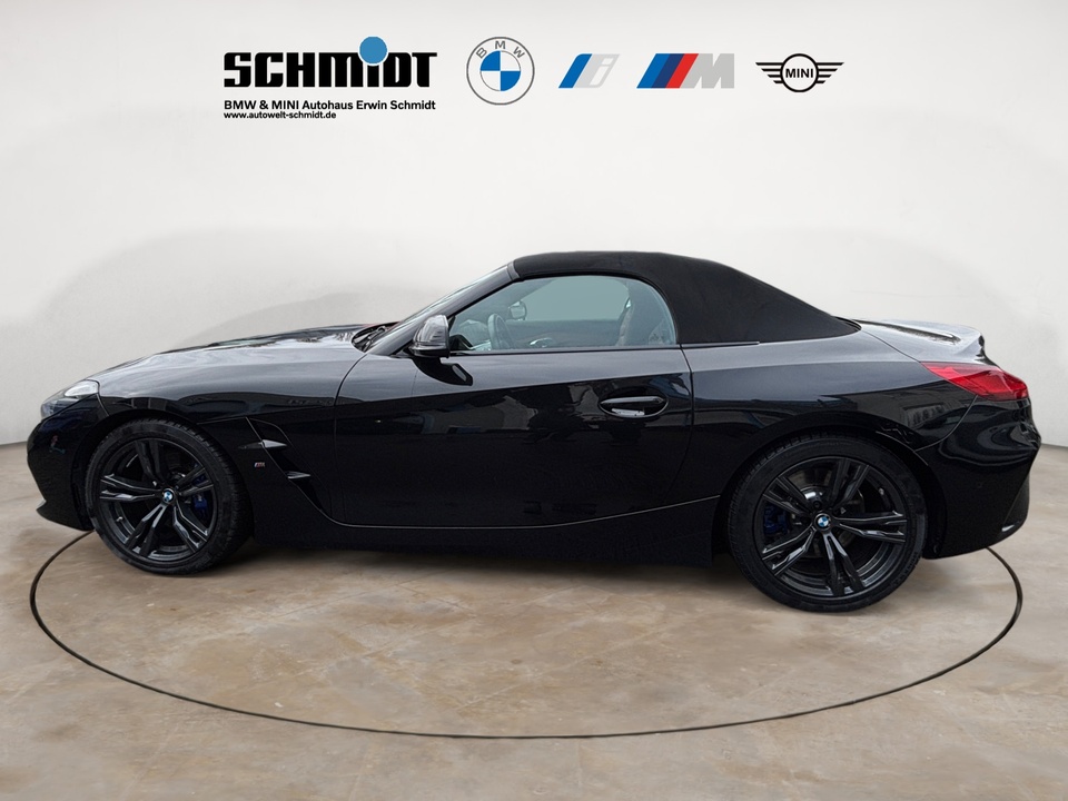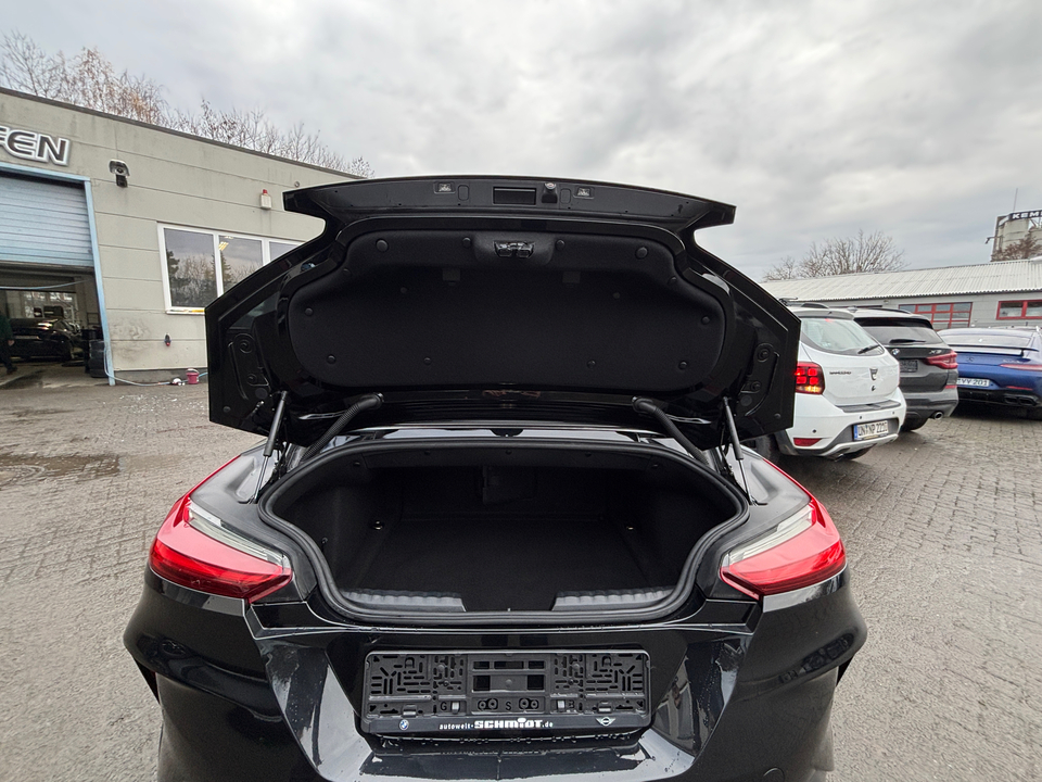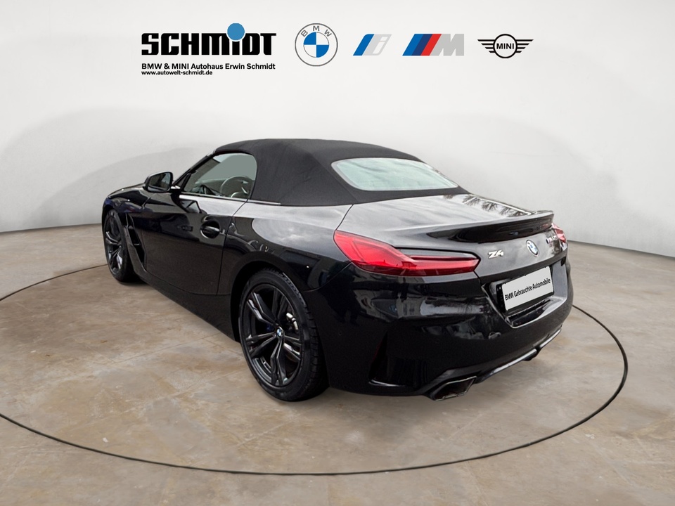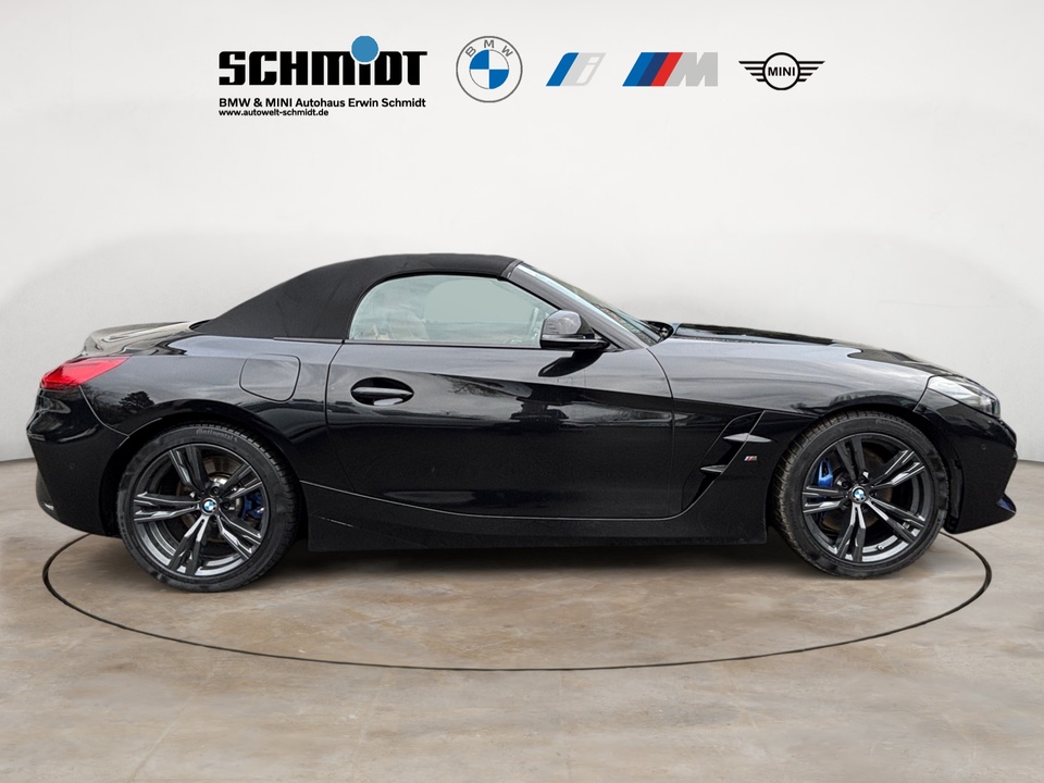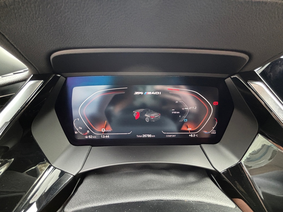 Innovationspaket Adaptiver LED-Scheinwerfer Sitzverstellung, elektrisch, mit Memory für Fahrersitz Head-Up Display Metallic-Lackierung Driving Assistant Aktive Geschwindigkeitsregelung mit Stop&Go-Funktion (ACC) Komfortzugang (Keyless Entry) Parking Assistant M Hochglanz Shadow Line mit erweiterten Umfängen Telefonie mit Wireless Charging Innen- und Außenspiegelpaket Fernlichtassistent Spiegelkappen schwarz Reifenpannenset Leder Vernasca mit Dekorsteppung Interieurleisten Schwarz hochglänzendSonderausstattung ab Werk blau M Sportdifferenzial Steptronic Sport Getriebe Adaptives Fahrwerk Alarmanlage Innenspiegel.automatisch abblendend Durchladesystem: Fondsitzlehne.Teilung 40:20:40 Ablagenpaket Sitzheizung für Fahrer und Beifahrer Instrumententafel in Sensatec Schwarz Ambientes Licht Klimaautomatik mit 2-Zonen-Regelung HiFi Lautsprechersystem BMW Live Cockpit Professional M Lederlenkrad M Sportsitze für Fahrer und Beifahrer M Hochglanz Shadow LineSerienaustattung Zwei Sitzplätze mit Sitzkonfiguration: 2+0 Zehn Lautsprecher Subwoofer 4 Scheibenbremsen (4 innenbelüftet) und lackierte Bremssättel ABS Geschwindigkeitsregelanlage Beleuchteter Make-up-Spiegel für Fahrer und Beifahrer Einparkhilfe vorne, hinten Sensor Heckantrieb Sperrdifferential mit begrenztem Schlupf elektronisches und hinten Antriebs-Schlupf-Regelung Turboaufladung Kraftstoff : bleifrei, 95 Oktan Tankinhalt 52 Liter Bordcomputer mit Durchschnittskraftstoffverbrauch Tagfahrlicht Zentralverriegelung (mit Fernbedienung) Alarmanlage Motorleistung nach EEC : Maximalleistung in KW: 250 , Maximalleistung in PS: 340 bei 5.000 U/min , Maximales Drehmoment in Nm: 500 bei 1.600 U/min Elektrisch Softtopes mit Heckfenster aus Glas Fahrer-Airbag, Beifahrer-Airbag mit Deaktivierung für Beifahrerairbag Seiten-Airbag vorne und Kopfschutz 2 integrierte Kopfstützen vorne Sicherheitsgurte vorn für Fahrer und Beifahrer Armlehne für Vordersitze Fahrersitz und Beifahrersitz Sportsitz mit Sitzheizung, mechanischer Lehnenneigungsverstellung, mechanischer Längsverstellung und mechanischer Höhenverstellung Multifunktions-Alu & Lederlenkrad höhenverstellbar und längsverstellbar Unabhängige Ein-Gelenk-Federbeinachse mit Stabilisator und Schrauben-Federung vorne, Unabhängige Mehrlenkerachse mit Stabilisator und Schrauben-Federung hinten Sportfahrwerk Aktive Radaufhängung mit wählbarer Einstellung elektronisch 8-Gang Automatikgetriebe mit manueller Gangwahl und Schalthebel am Lenkrad Automatik mit manuellem Modus, Schaltwippen und 0 Windschutzscheiben-Wisch-Wasch-Anlage mit Regensensor Elektrische Fensterheber mit Impulsschaltung für zwei Fenster vorn Gewichte: Zulässiges Gesamtgewicht (kg): 1.860, Leergewicht (kg): 1.640, Anhängelast gebremst (kg): 0 und Anhängelast ungebremst (kg): 0 Navigationssystem mit Bedienung über Touch Screen, Datenquelle: Internet 10,30 Zoll-Bildschirm, Verkehrsinformation und Verkehrsinfo Monate inklusive: 24 Windschott hinter Sitzen Vorbereitung Featrues on demand Isofix Sprachbedienung herstellereigen und KI unterstützt Telematik mit automatischem Notruf, mit SIM im Fahrzeug, Tracking System, Concierge Service Monate inkl.: und Pannenhilfe Kraftstoffverbrauch WLTP ICE, 7,9 l/100 km kombiniert, 7,8, 8,0, 12,8, 12,5, 30 und 29 Lokale Sprache Deutsch, BMW, Z4, M40i A und M40i A Autom. Warnblinker bei starker Bremsung Crash Warnsystem aktiviert Bremslicht, automatische Notbremsung, Bremst bei niedriger Geschwindigkeit, Fußgängerschutz, visuelle/akustische Warnung, Funktion über 130 km/h 78 mph, Funktion über 50 km/h 30 mph, Funktion unter 50 km/h 30 mph und Überwachung Fahrstil Bluetooth Start/Stop Spurassistent aktiviert Lenkung Display mit 10,30 Zoll Bildschirm Kombiinstrument 1, Bildschirmgröße (cm):, Drehknopf und Wahlrad, Display mit 10,30 Zoll Bildschirm und Touch-Bedienung Armaturenbrett 1, Bildschirmgröße (cm):, fix, Drehknopf und nein Energie Rückgewinnung Verkehrszeichenerkennung Interner Speicher/Festplatte 320,00 GB Fahrereinstellungen Motorcharakteristik, Lenkung und Fahrwerk Wifi Netzwerk Fernbedienung Klimaanlage per Telefon, mit Zeitschaltuhr, mit Heizen und mit KühlenWeitere Ausstattung inkl. 24 Monate Euro Plus Garantie, ohne jegliche Selbstbeteiligung im Schadensfall!GarantieBMW Premium Selection