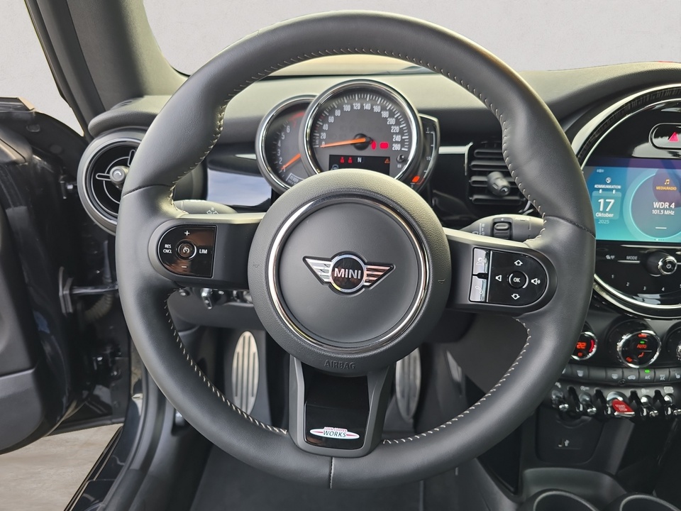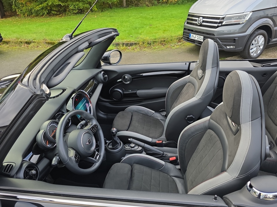 Dinamica-/Lederkombination Carbon Black 2-Zonen-Klimaautomatik Parkassistent Sitzheizung für Fahrer und Beifahrer Multifunktionales Instrumentendisplay Connected Media Außenspiegelkappen in WagenfarbeSonderausstattung ab Werk Adaptives Fahrwerk Sport-Lederlenkrad Nappa John Cooper Works Aerodynamic kit Piano Black Exterieur Fußmatten in Velours Interieuroberfläche Piano Black Ambientes Licht MINI Driving ModesSerienaustattung Vier Sitzplätze mit Sitzkonfiguration: 2+2 Sechs Lautsprecher und Subwoofer 4 Scheibenbremsen (2 innenbelüftet) ABS Fernbedienbare Heckklappenfernentriegelung Geschwindigkeitsregelanlage Leseleuchten vorne und hinten Beleuchteter Make-up-Spiegel für Fahrer und Beifahrer Einparkhilfe hinten Radar Frontantrieb Sperrdifferential mit begrenztem Schlupf elektronisches und vorne Antriebs-Schlupf-Regelung Eins Turboaufladung Kraftstoffsystem mit direkter Benzineinspritzung Kraftstoff : bleifrei, 95 Oktan Tankinhalt 40 Liter Außentemperaturanzeige Bordcomputer mit Durchschnittsgeschwindigkeit, Durchschnittskraftstoffverbrauch, momentaner Kraftstoffverbrauch und Reichweite Tagfahrlicht Zentralverriegelung mit Schließung der elektr. Fenster Motorleistung nach EEC : Maximalleistung in KW: 100 , Maximalleistung in PS: 136 bei 4.500 U/min , Maximales Drehmoment in Nm: 220 bei 1.500 U/min Elektrisch Softtopes mit Heckfenster aus Glas Fahrer-Airbag intelligent, Beifahrer-Airbag mit Deaktivierung für Beifahrerairbag intelligent Seiten-Airbag vorne 2 Kopfstützen vorne, 2 höhenverstellbare Kopfstützen hinten Sicherheitsgurte vorn für Fahrer und Beifahrer , Gurtstraffer vorne Sicherheitsgurte hinten links und rechts Fahrersitz und Beifahrersitz Sportsitz mit mechanischer Lehnenneigungsverstellung, mechanischer Längsverstellung, mechanischer Höhenverstellung und mechanischer Oberschenkelauflage Multifunktions-Lederlenkrad höhenverstellbar und längsverstellbar Unabhängige Ein-Gelenk-Federbeinachse mit Stabilisator und Schrauben-Federung vorne, Unabhängige Mehrlenkerachse mit Stabilisator und Schrauben-Federung hinten Aktive Radaufhängung mit wählbarer Einstellung elektronisch 6-Gang Schaltgetriebe manuell Windschutzscheiben-Wisch-Wasch-Anlage mit Regensensor Elektrische Fensterheber mit Impulsschaltung für zwei Fenster vorn Gewichte: Zulässiges Gesamtgewicht (kg): 1.680, Leergewicht (kg): 1.325, Anhängelast gebremst (kg): 0 und Anhängelast ungebremst (kg): 0 Elektr. Bremskraftverteilung Isofix Telematik mit automatischem Notruf, mit SIM im Fahrzeug, Tracking System und Concierge Service Monate inkl.: Partikelfilter Kraftstoffverbrauch ECE 99/100, 7,1 l/100 km Stadt, 4,6 l/100 km Überland und 5,6 l/100 km kombiniert, Kraftstoffverbrauch WLTP ICE, 6,0 l/100 km kombiniert, 5,9, 6,4, 16,9 und 15,6 Crash Warnsystem Müdigkeitswarnung, visuelle/akustische Warnung, Funktion über 130 km/h 78 mph und Funktion über 50 km/h 30 mph Bluetooth inkl. Musik Streaming Start/Stop Multi-Funktions-Monitor mit 8,8 Zoll Bildschirm und Touch-Bedienung Armaturenbrett 1, Drehrad und Bildschirmgröße (cm): 22,4 Energie Rückgewinnung Motor Fahrereinstellungen Motorcharakteristik, Lenkung und Fahrwerk Fernbedienung Klimaanlage per Telefon und mit Kühlen Installierte Apps 4 Airbags Ambientelicht Media Control Drehrad und Touch Screen WLTP Emissionen ICE, kombiniert: 135,0, kombiniert Fzg niedrig: 134,0 und kombiniert Fzg hoch: 144,0 Elektrisches System 12 Remote Services Fensterbruchwarnung, Fahrzeug finden, Ton/Blinken, 999 Monate inklusive Notruf Optik Schwarz USB Ladeanschluss vorne TürschwellerschutzWeitere Ausstattung inkl. 24 Monate Euro Plus Garantie, ohne jegliche Selbstbeteiligung im Schadensfall!GarantieMINI NEXTIrrtümer und Zwischenverkauf vorbehalten.(CRCO 20.11.2025 08.40)