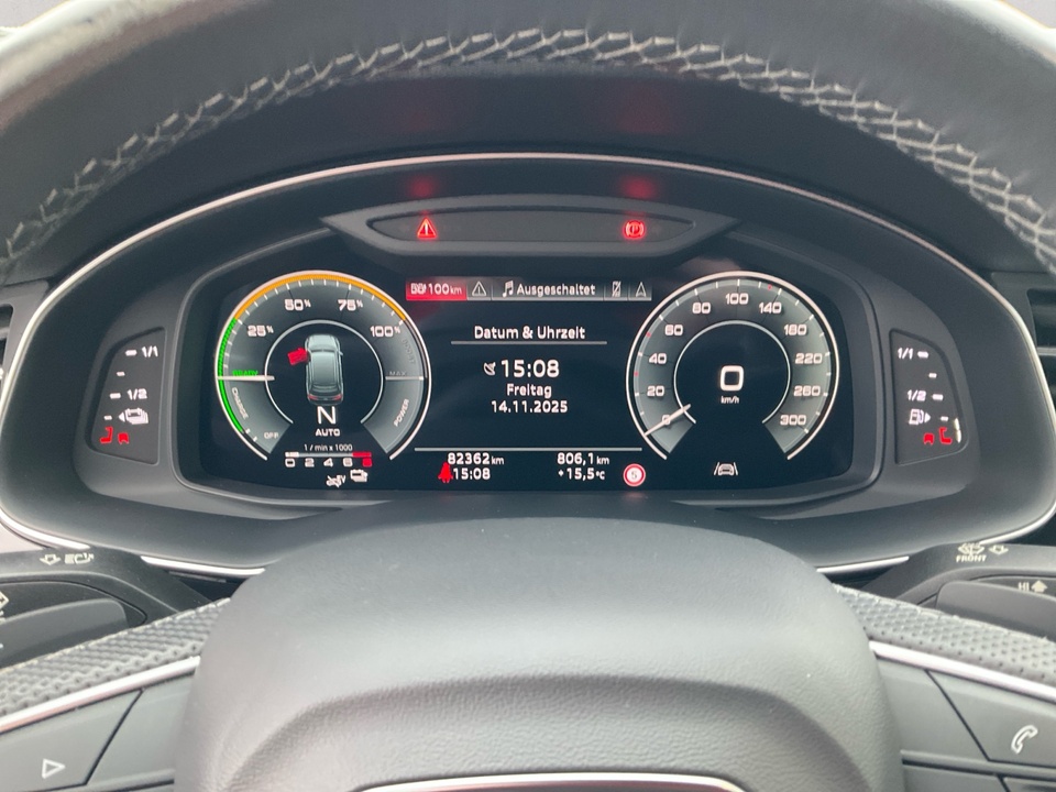 S line Sportpaket Aluminium-Gussräder im 10-Speichen-Stern-Design, graphitgrau, glanzgedreht, Größe 9 J × 20 mit Reifen 285/45 R 20 Privacy-Verglasung (Scheiben abgedunkelt) Dachhimmel in Stoff schwarz Komfortmittelarmlehne vorn Alcantara Frequenz/Leder-Kombination Dekoreinlage Aluminium matt gebürstet Einstiegsleisten mit Aluminiumeinlage vorn/hinten, beleuchtet, vorn mit S-SchriftzugSonderausstattung ab Werk Audi connect Navigation & Infotainment Audi drive select Außenspiegel.elektrisch anklappbar Außenspiegel in Wagenfarbe Bedientasten schwarz glänzend mit haptischem Feedback und Aluminiumoptik Interieur Dachreling schwarz Halteassistent Audi pre sense basic Spurverlassenswarnung Kamerabasierte Verkehrszeichenerkennung Frontscheibe in Wärmeschutzverglasung Gepäckraumklappe elektrisch öffnend und schließend Geschwindigkeitsregelanlage LED-Heckleuchten Innenspiegel automatisch abblendend Audi virtual cockpit Lederlenkrad im 3-Speichen-Design mit Multifunktion plus MMI Navigation plus Sitzheizung Audi sound system Serienfahrwerk Heckspoiler Ladekantenschutz in Edelstahl Einparkhilfe plus mit Umgebungsanzeige Komfortklimaautomatik 4-Zonen Sportsitze vorn Vordersitze elektrisch einstellbar 4-Wege-Lendenwirbelstütze Abgasanlage.Endrohrblenden verchromt Krafstoffbehälter 54 lSerienaustattung Elektrische Heckklappen-Zuziehhilfe Geschwindigkeitsregelanlage Einparkhilfe vorne, hinten, seitlich Sensor Elektroantrieb-mit-Lithium-Ionen Batterie Batterie kWh: 17,90, Onboard Charger (kW): 7,4, Anzahl Batteriemodule: 14 und Batteriehersteller: LG Energy Solution Tagfahrlicht Kopf-/Dach Airbag vorn und hinten Dachreling schwarz Fahrer-Airbag intelligent, Beifahrer-Airbag mit Deaktivierung für Beifahrerairbag intelligent Seiten-Airbag vorne Fahrersitz und Beifahrersitz Einzelsitz mit fünf elektr. Verstellmöglichkeiten, Sitzheizung, elektrischer Lehnenneigungsverstellung, elektrischer Längsverstellung und elektrischer Höhenverstellung 2-Wege elektrisch Navigationssystem mit Bedienung über Touch Screen, Datenquelle: Internet (Farbe), 12,30 Zoll-Bildschirm und Verkehrsinformation Sekundäre Motorleistung: Leistung max. in kW: 250, Leistung max. in PS: 340, Drehmoment max. in Nm: 450, 5.300 und 1.340 Sekundäre Leistungsdaten: höchstgeschwindigkeit (km/h) 240 Sekundärer Kraftstoffverbrauch Kombiniert: 2,6 und 90 Sprachbedienung für Radio, für Telefon, für Navigationssystem und andere Telematik mit automatischem Notruf, mit SIM im Fahrzeug und Concierge Service Monate inkl.: Partikelfilter Crash Warnsystem aktiviert Sicherheitsgurte, aktiviert Bremslicht, Müdigkeitswarnung, automatische Notbremsung, Bremst bei niedriger Geschwindigkeit, Fußgängerschutz, visuelle/akustische Warnung Bluetooth inkl. Musik Streaming Start/Stop Spurassistent aktiviert Lenkung Multi-Funktions-Monitor mit 12,30 Zoll Bildschirm Instrumente 1 und Bildschirmgröße (cm): 31,2, Multi-Funktions-Monitor mit 10,10 Zoll Bildschirm und Touch-Bedienung Armaturenbrett 1 und Bildschirmgröße (cm): 25,7, Multi-Funktions-Monitor mit 8,60 Zoll Bildschirm und Touch-Bedienung Armaturenbrett 2 und Bildschirmgröße (cm): 21,8 Energie Rückgewinnung Motor Zusätzliche Kraftstoffart bleifrei Hybridart Aktiv-Hybrid Plug-in Elektrisch angetriebene Räder 4x4 Verkehrszeichenerkennung Interner Speicher/Festplatte 128,00 GB Fahrereinstellungen Motorcharakteristik, Lenkung, Stabilitätskontrolle und Traktionskontrolle Wifi Netzwerk Ladeinformation mode 2, 8,25, 230, 2,30, 2,00 und 100, Ladeinformation mode 3, 2,50, 16, 7,40, 7,00 und 100 Elektromotor 1, 127,8 PS, 94,0 kW, 350 Nm und AC permanent Magnet synchron Energieverbrauch 21,7, 217, 0,5, 0,3, 0,2 und 0,3 Installierte Apps Text - Sprache/Sprache - Text Akustisches Fußgänger-Warnsystem Multikollisionsbremse 6 Airbags Media Control Touch Screen WLTP Emissionen HEV UF Weighted und kombiniert: 57,0 Elektrisches System 12 Ladestecker Type 2 (Mennekes), Ladekabel inklusive und Ladeanschluss AC 1 Position Anschluss DC3: hinten seitlich, Ladestecker Mode 2 (EVSE) und Ladekabel inklusive WLTP Stromverbrauch HEV electric energy cons-UF Wtd WLTP Elektroreichweite HEV Equivalent All electric range, 48, 48 und 44 Notruf USB Ladeanschluss vorne Türschwellerschutz Aluminium beleuchtet Energieeffizienzklasse: A+Weitere Ausstattung 12 Monate Gebrauchtwagengarantie inklusive!Irrtümer und Zwischenverkauf vorbehalten.(CRCO 21.11.2025 23.46)